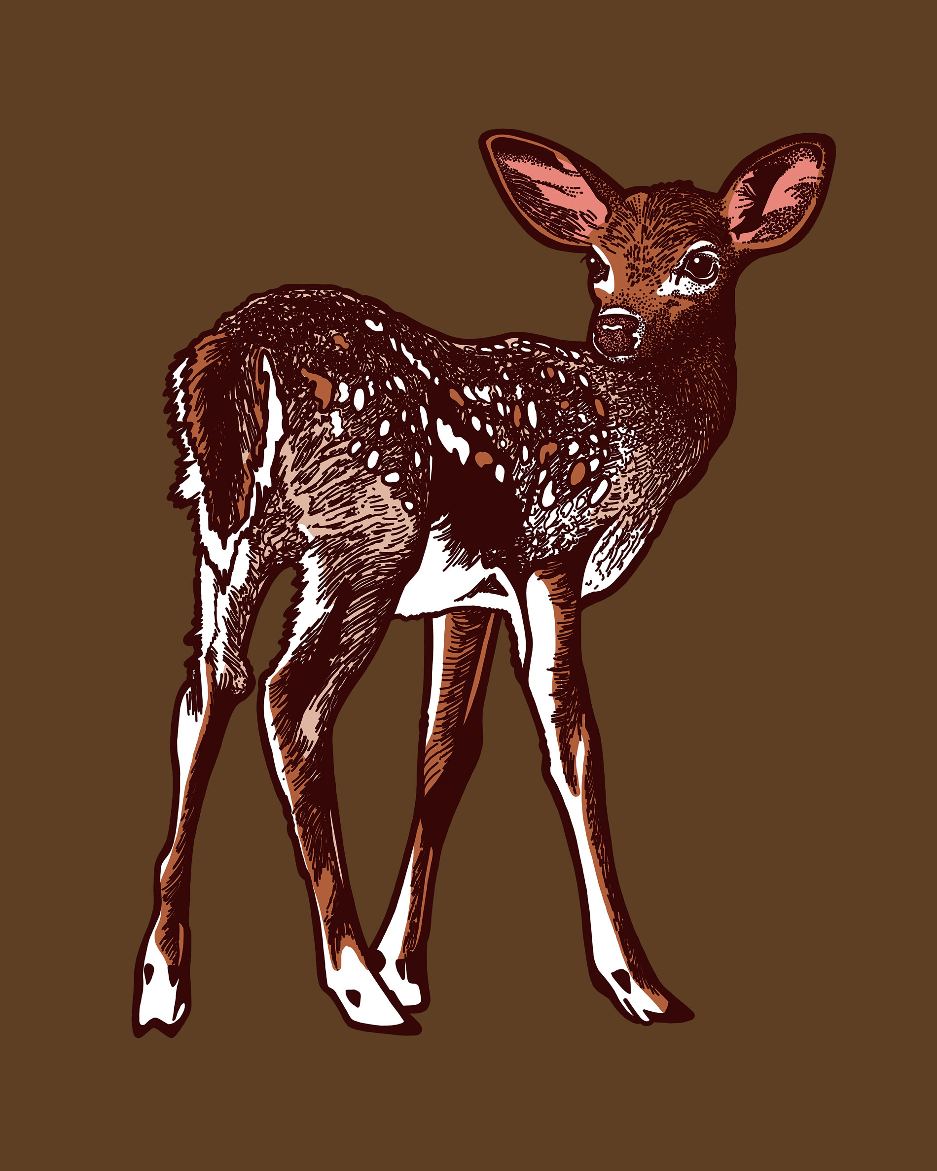Een digitale illustratie van een hertje in allerlei bruine tinten tegen een warm bruingroene achtergrond. De tekening heeft een natuurlijke en rustige uitstraling. De veelheid aan kleuren en het patroon in de vacht van het diertje vond ik zo mooi dat ik dit wilde vastleggen. Het lijkt alsof ze ergens door wordt opgeschrikt en even checkt of de kust veilig is.