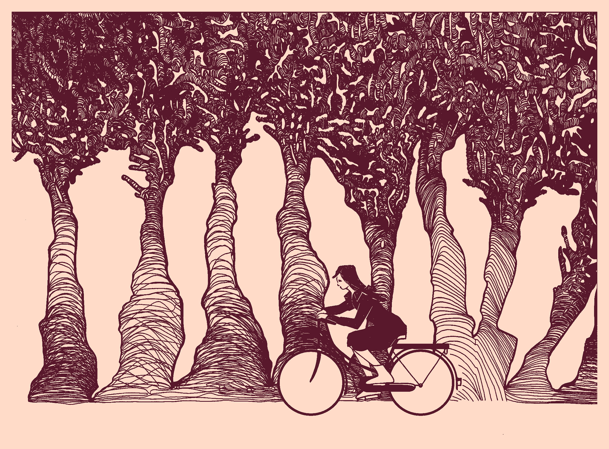 Een illustratie van een meisje onderweg op de fiets met tegen de achtergrond prachtige hoge bomen. Bomen zijn altijd prachtig in hun statigheid en grootsheid. Op pad gaan en zien wat voor moois er allemaal te zien is buiten is altijd fijn en gaf me de inspiratie voor deze tekening.