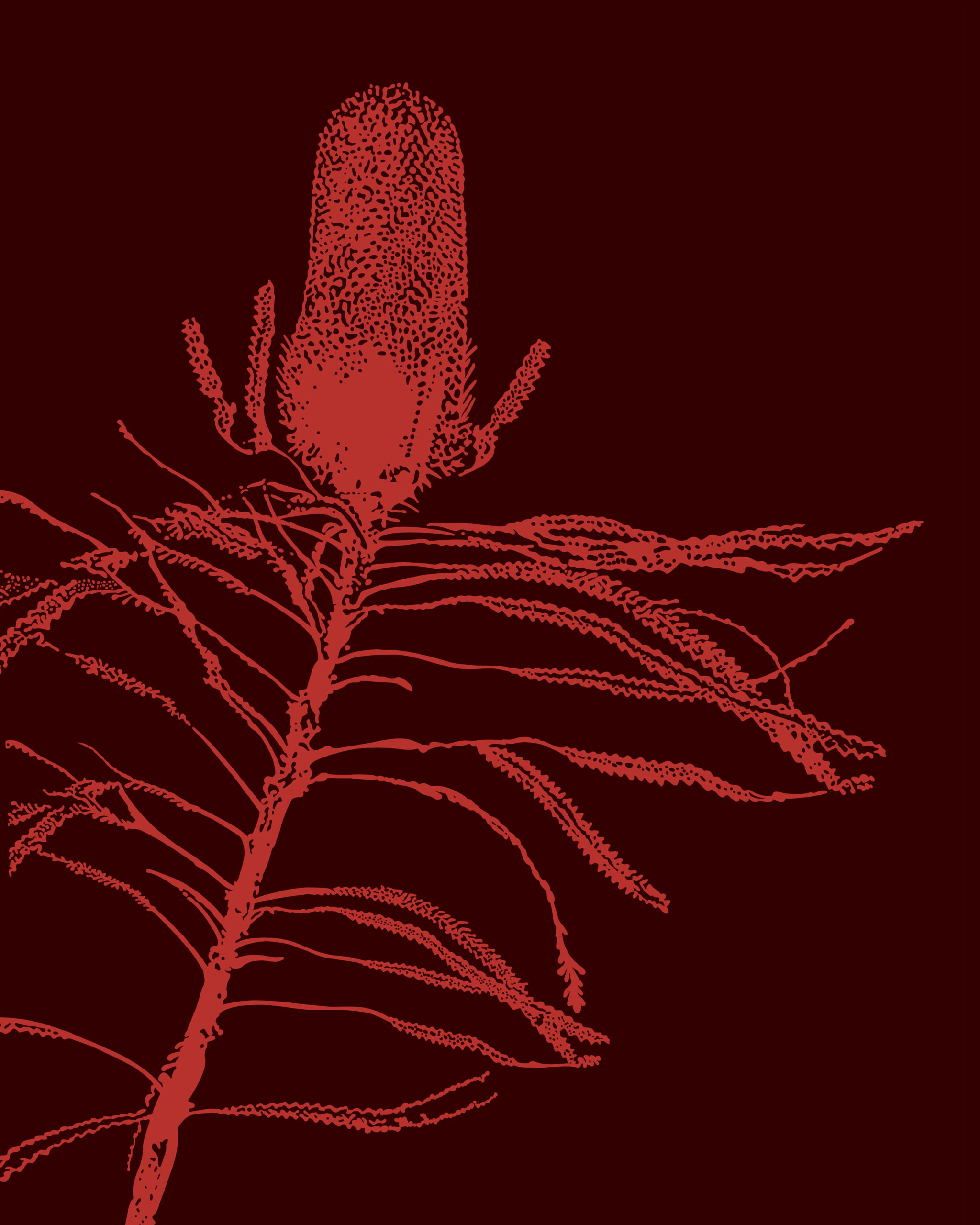 Een illustratie van een roze plant tegen een donkere rode achtergrond. Het silhouet van de plant is prachtig en door het contrast komt dit nog meer naar voren. De kleuren vindt ik mooi tegen elkaar afsteken en geven het een warme uitstraling.