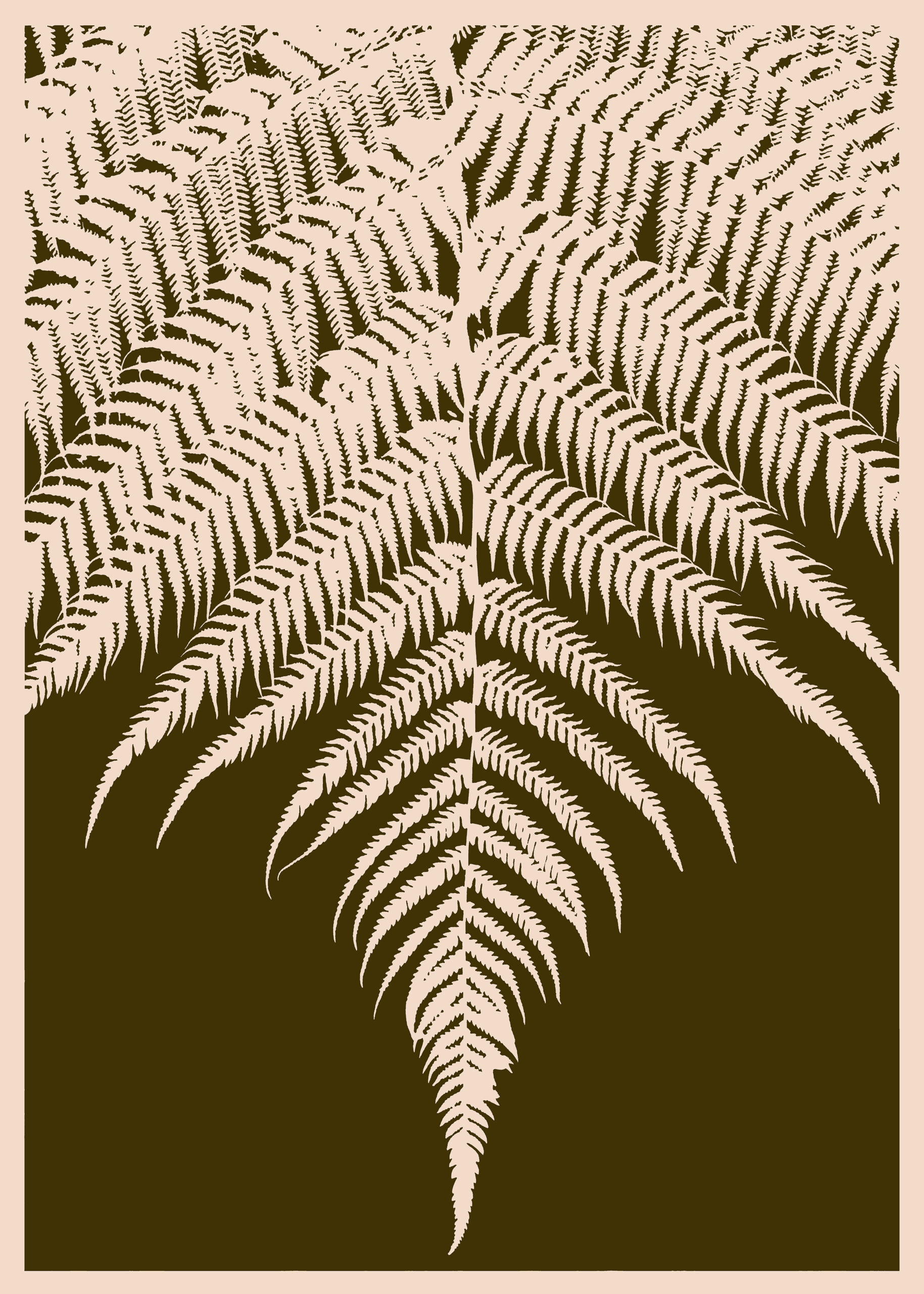Een digitale illustratie van een varen blad. De tekening geeft een close up van een varen blad weer in een lichte kleur tegen een contrasterende warme bruine achtgrond. Tijdens een reis in Nieuw Zeeland kwam ik overal de prachtigste varens tegen in allerlei kleuren en maten. Een varen met hele grote bladeren was de inspiratie voor deze tekening. Ik heb de tekening in twee kleuren gemaakt om het bijzondere silhouet en de symmetrie van het blad het sterkst naar voren laten komen.