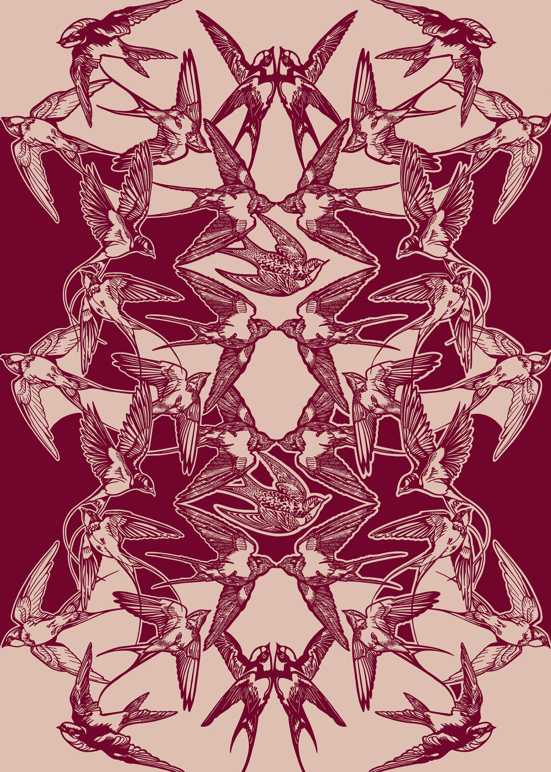 Een illustratie van een groep zwaluwen die uitvliegt! Door de contrasterende kleuren komt het silhouet van de vogels extra naar voren en lijken ze zo van het beeld weg te vliegen.